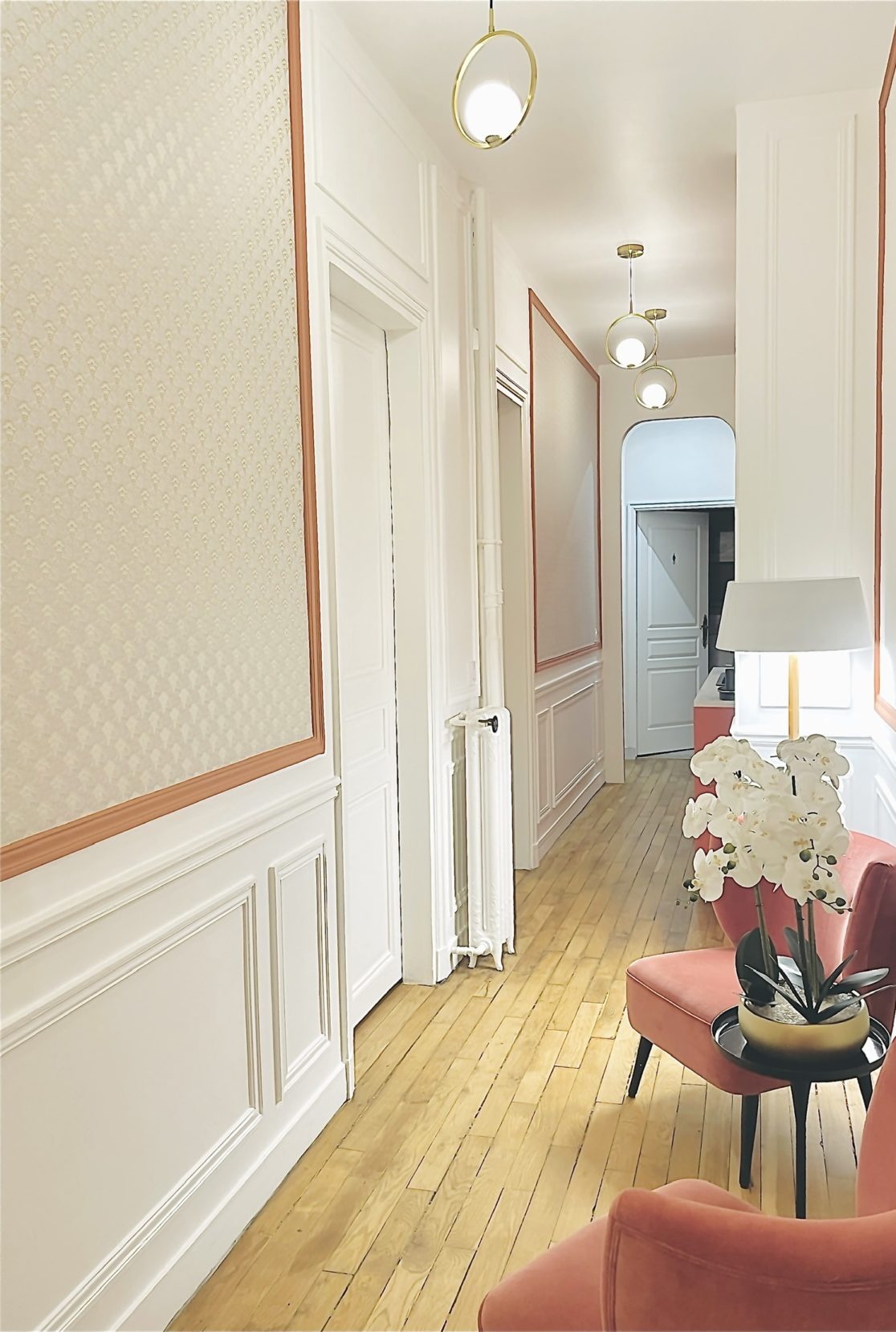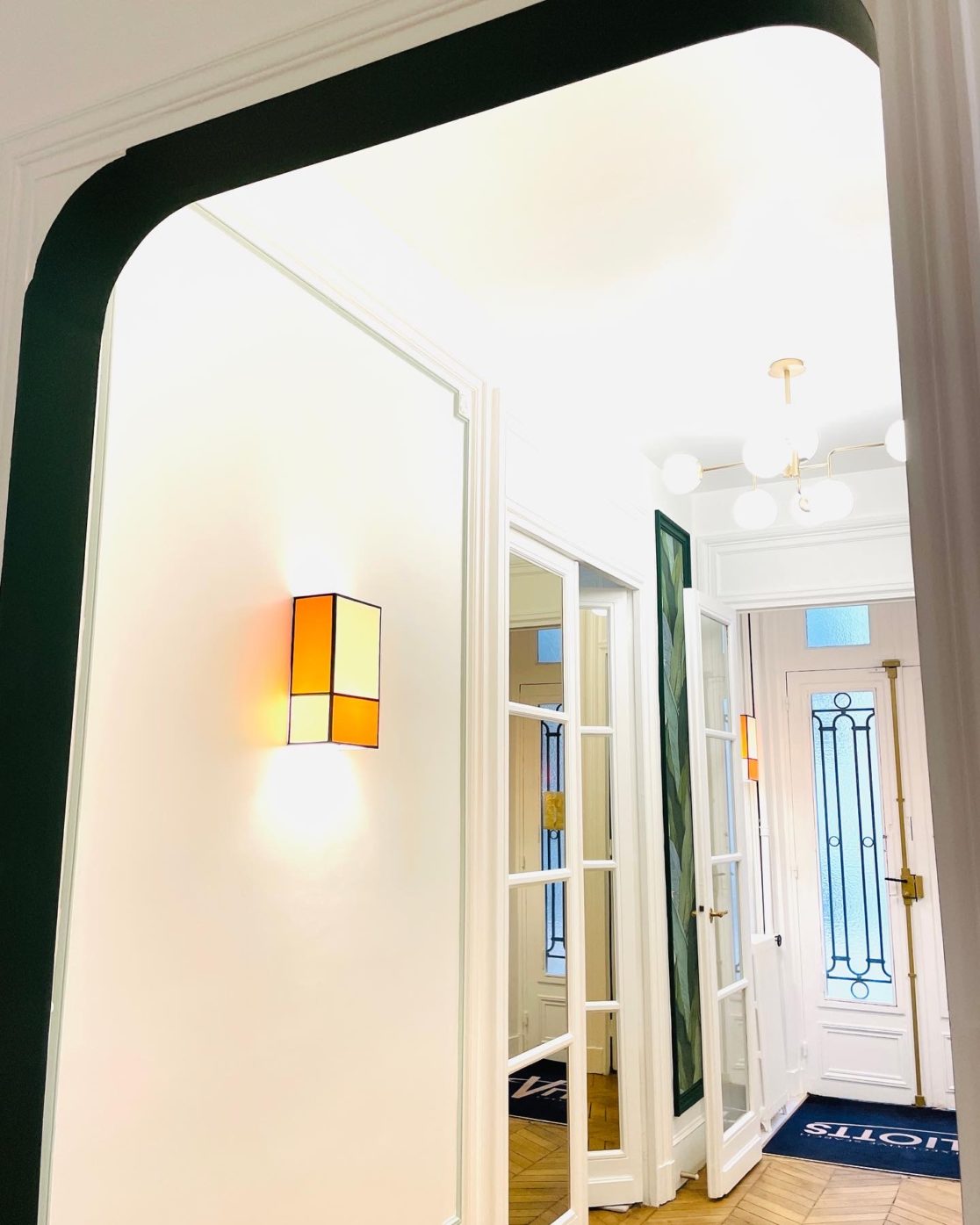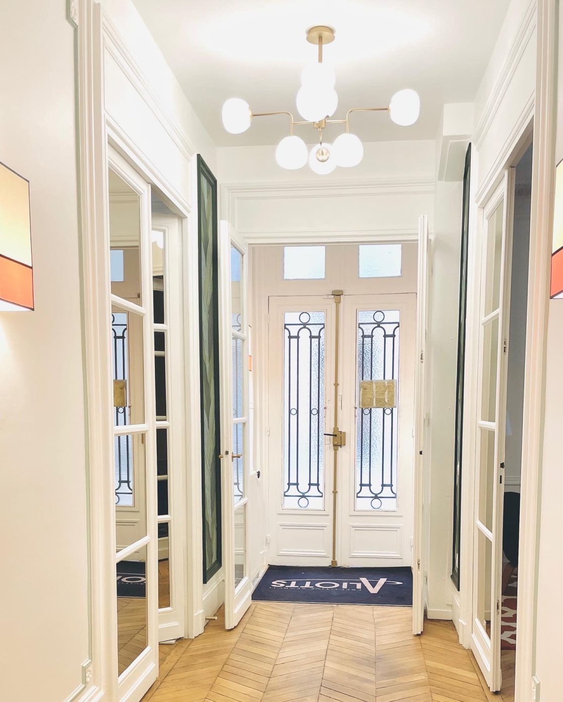 Les caissons de moulures de l'entrée ont été travaillés pour habiller les volumes et donner un certain standing au premier regard. Un tapis d'entrée sur-mesure a été conçu pour donner une identité aux lieux.