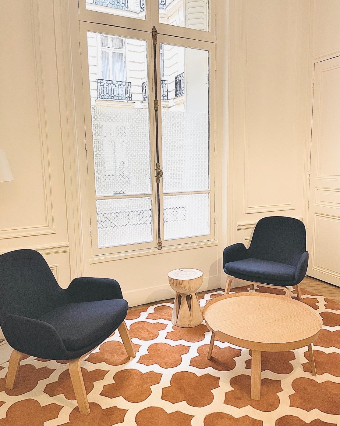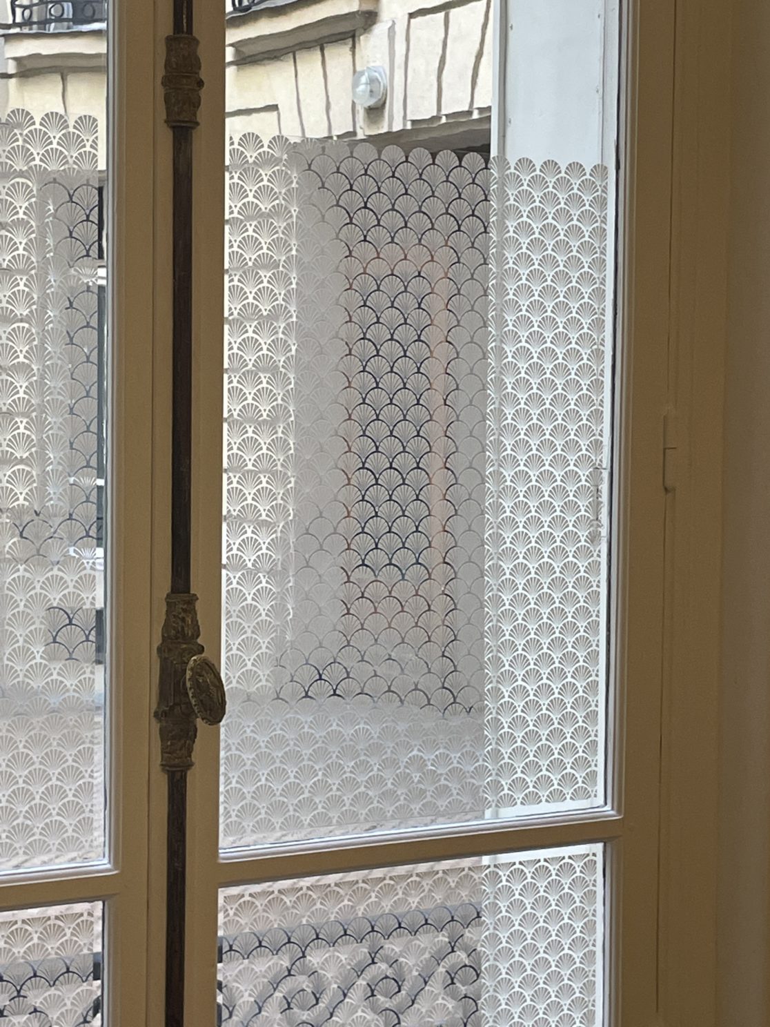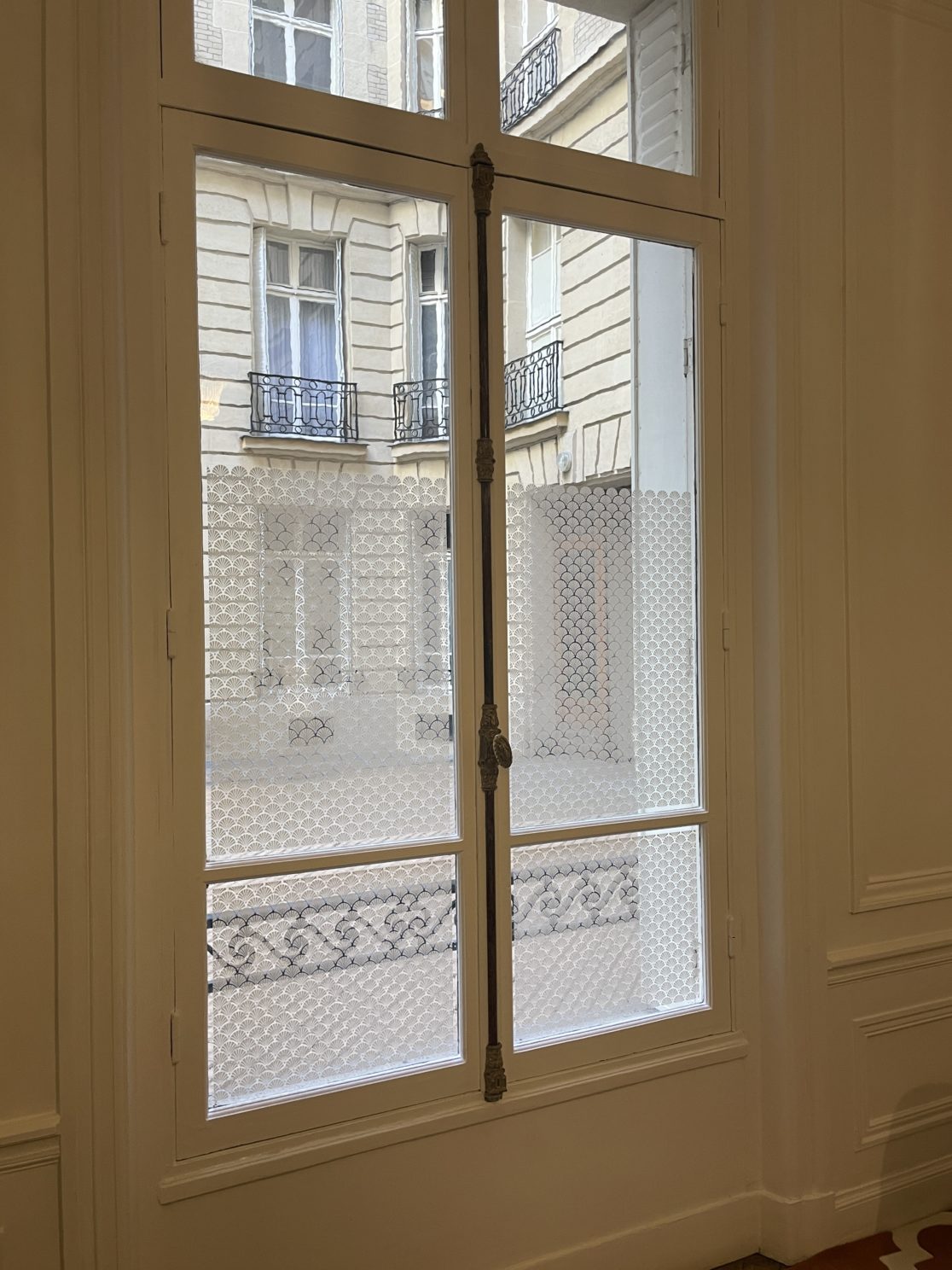 Une vitrophanie personnalisée (adhésif spécifique sur vitrage) a été proposée dans la salle de réunion et les bureaux pour apporter plus de confidentialité tout en préservant la luminosité extérieure et le charme des lieux.