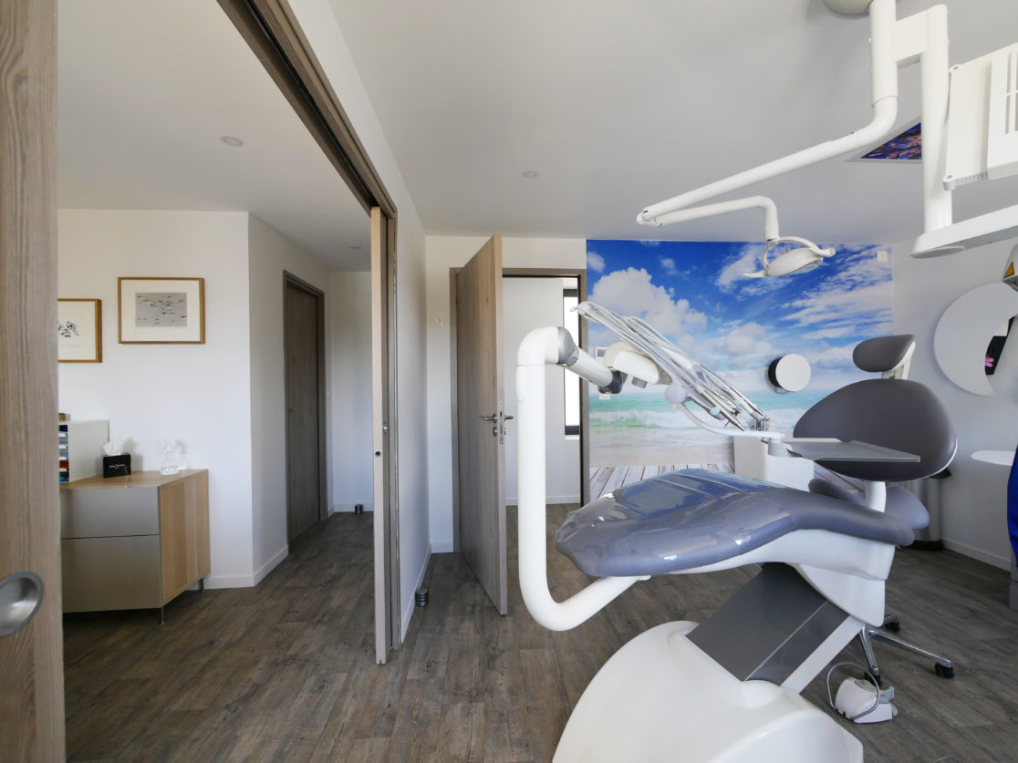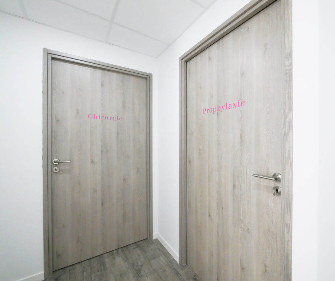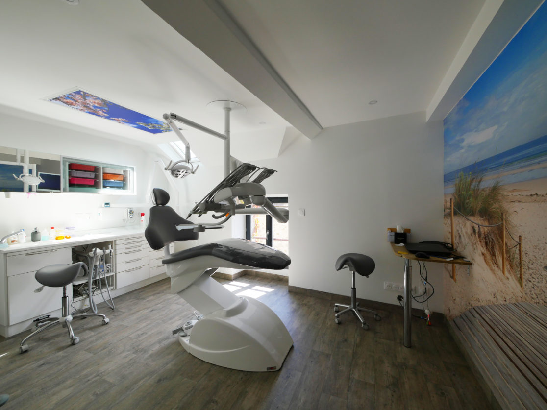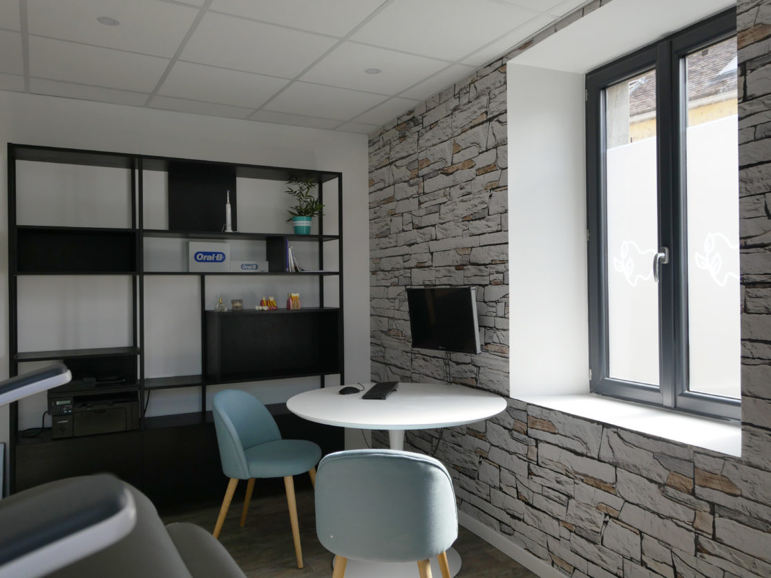 La salle de prophylaxie a été pensée comme un espace plus convivial destiné à l'écoute et à un échange moins formel avec le patient. Un papier peint imitation pierres a été sélectionné pour rappeler la proximité avec la nature.