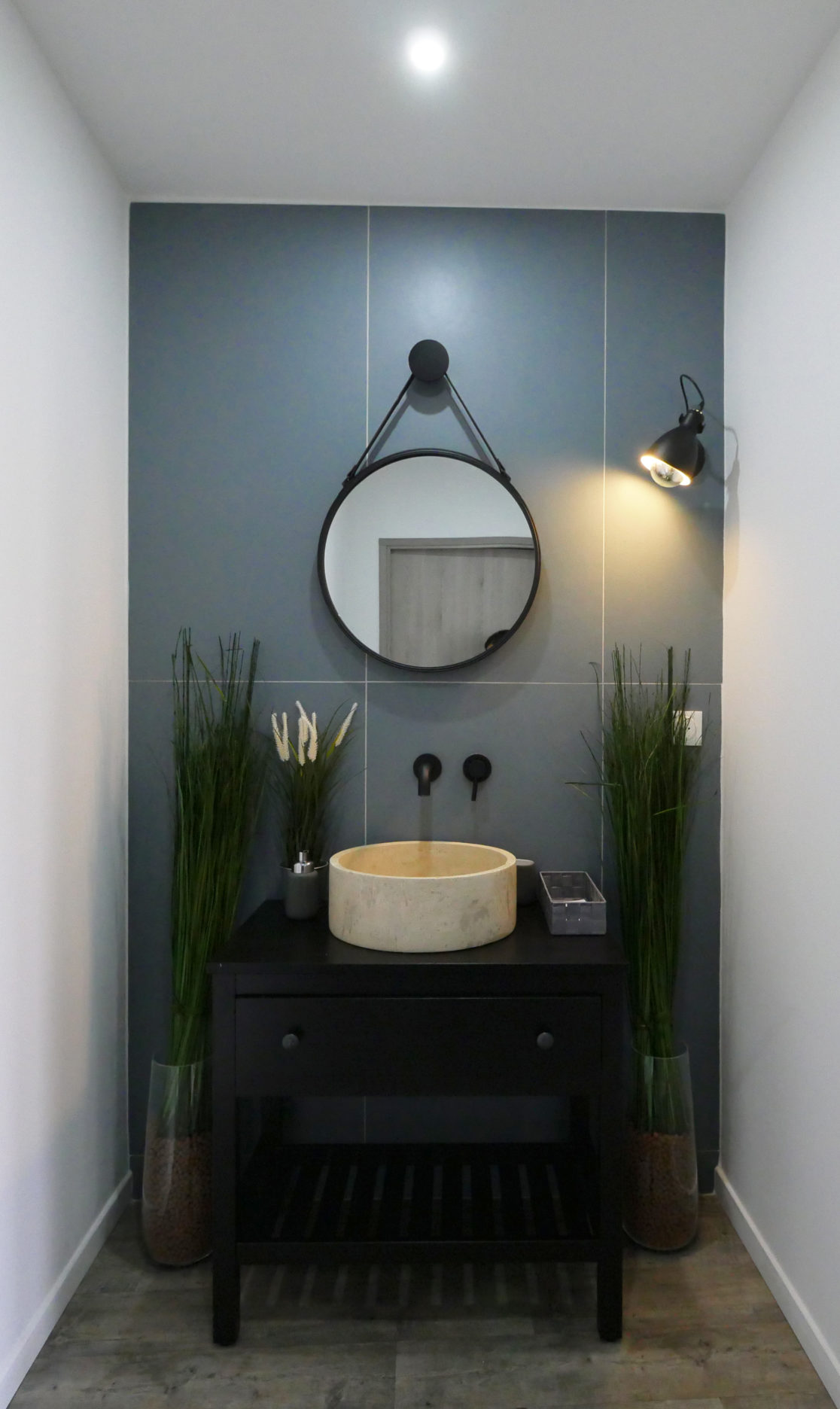 La clinique se situant entre Seine et forêt, des tonalités de bleu et un mur d'eau végétal ont été utilisés pour décorer la salle d'attente. Le sol (adapté aux espaces de soins) et les portes ont été choisis pour rappeler le bois de la forêt.