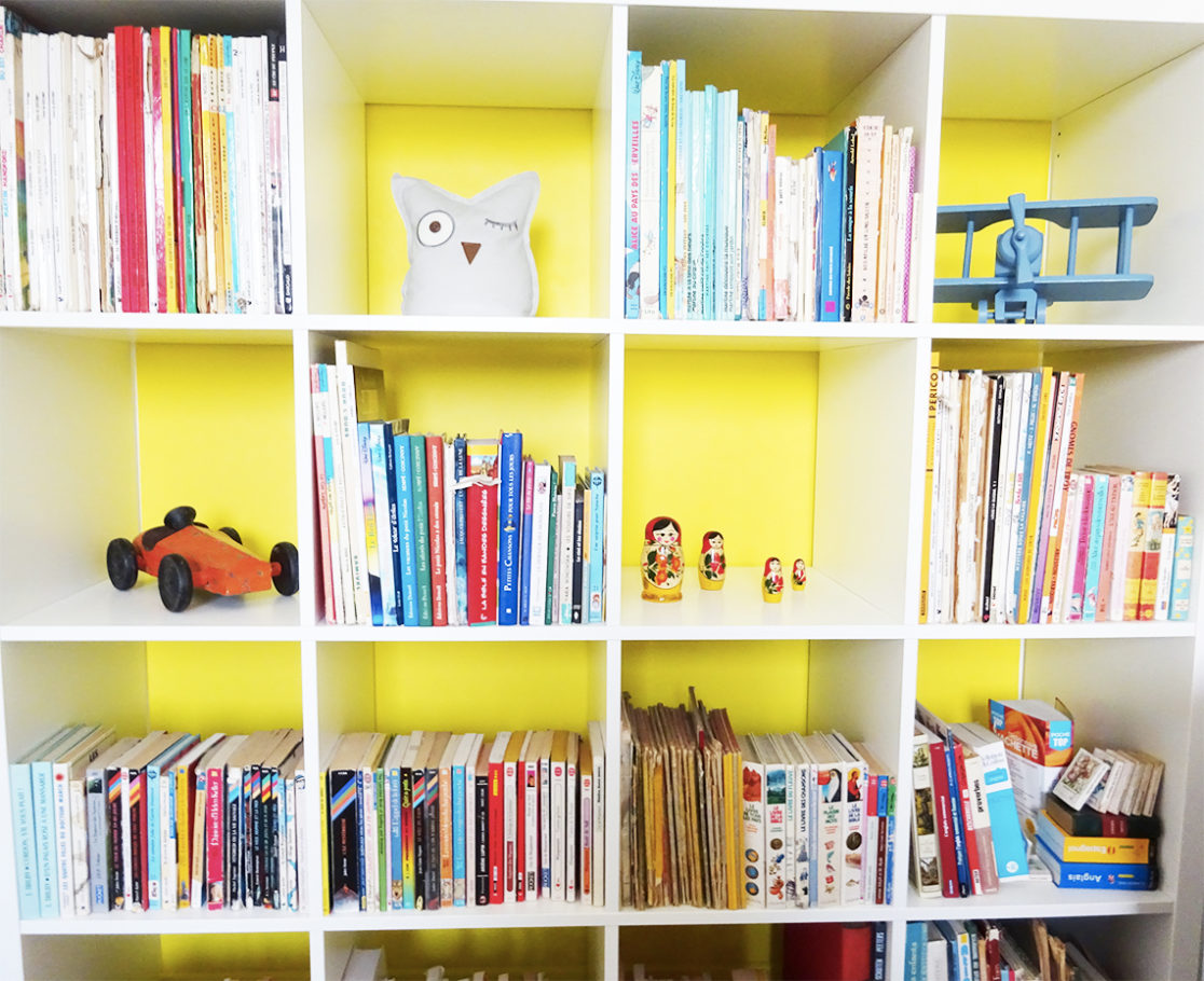 Création d'une bibliothèque colorée pour le coin enfants.
