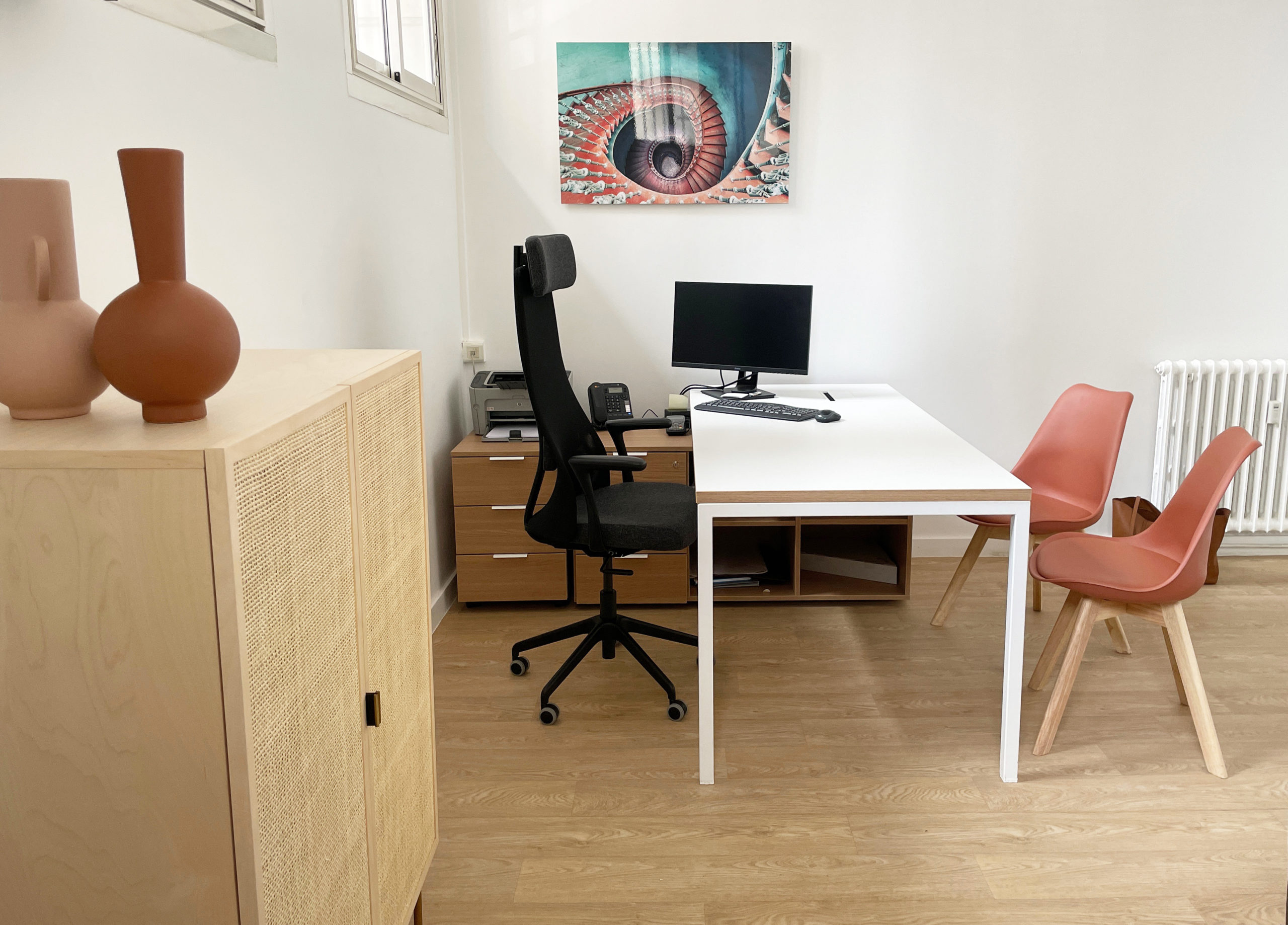 Dans les espaces de travail d'un cabinet de recrutement, un mobilier ergonomique et des solutions de rangement esthétiques ont été sélectionnés afin d'offrir aux collaborateurs un confort de travail optimal.