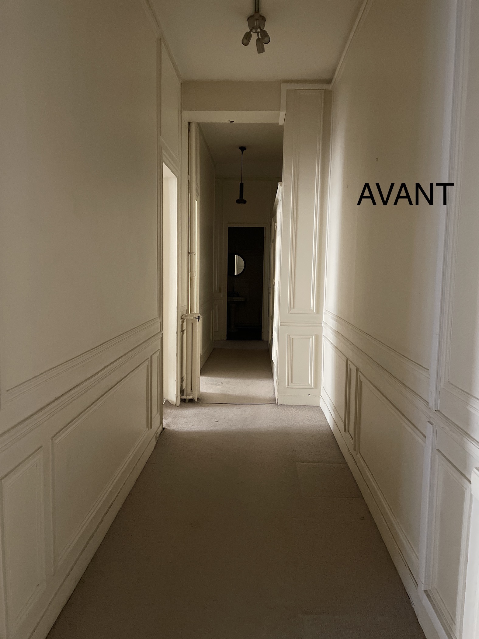 Les caissons de moulures de l'entrée ont été travaillés pour habiller les volumes et donner un certain standing au premier regard. Un tapis d'entrée sur-mesure a été conçu pour donner une identité aux lieux.