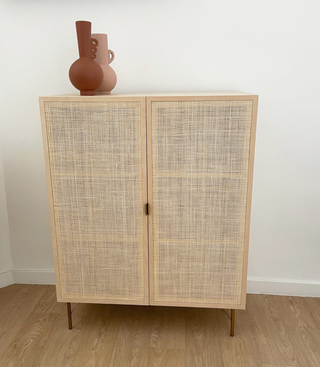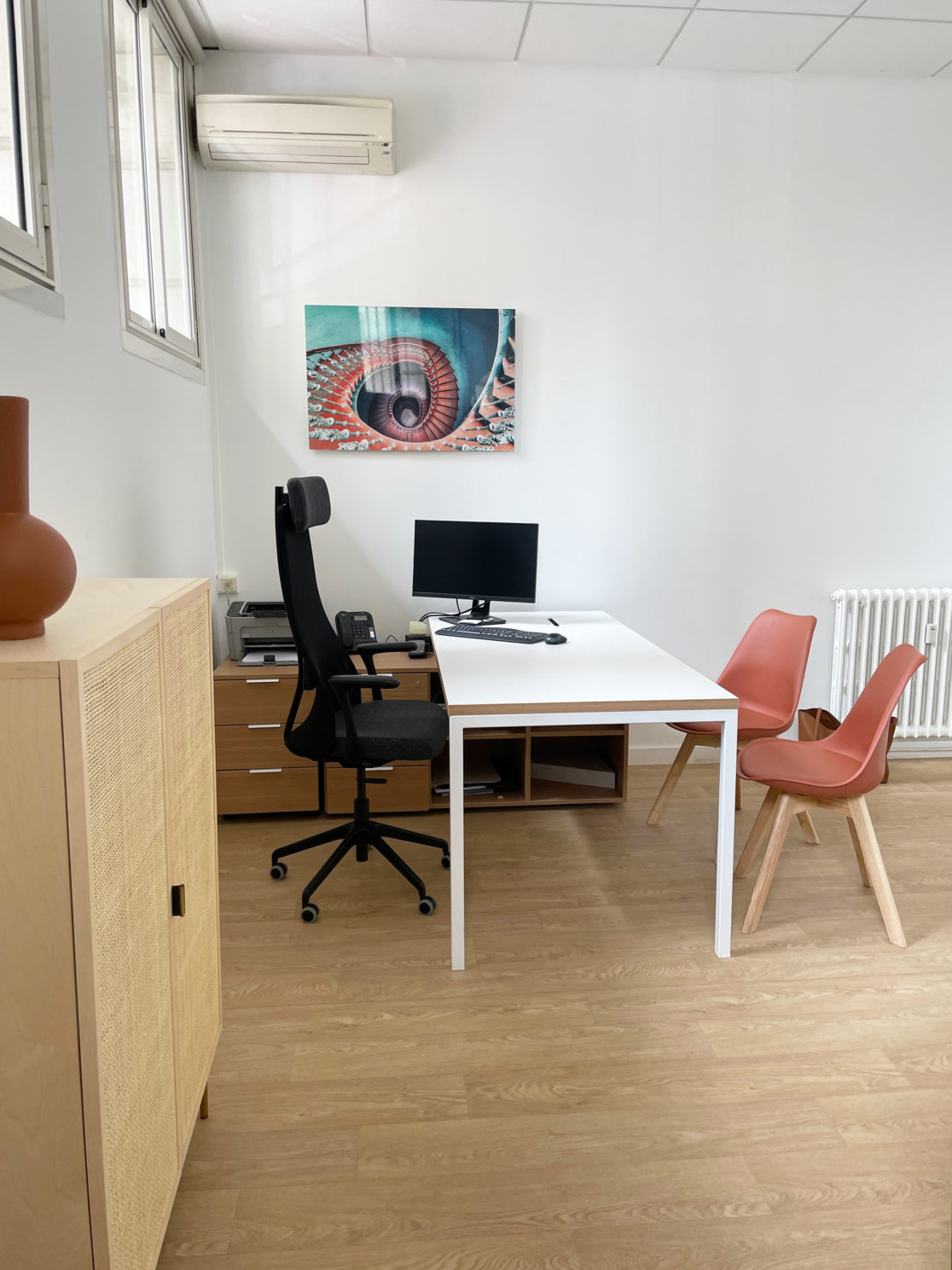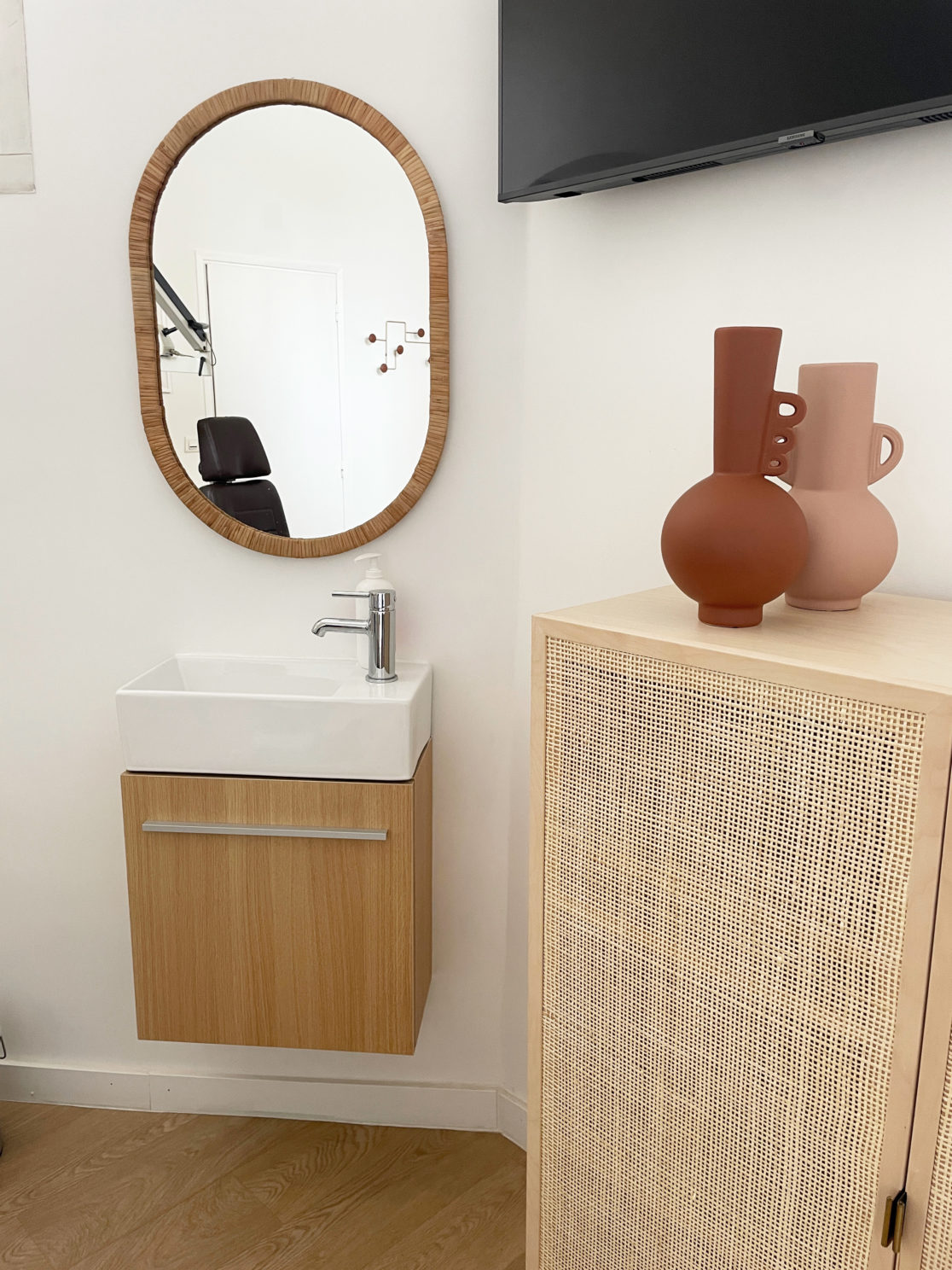 La décoration mêle le bois clair, au cannage et aux déclinaisons de nuances terracotta.