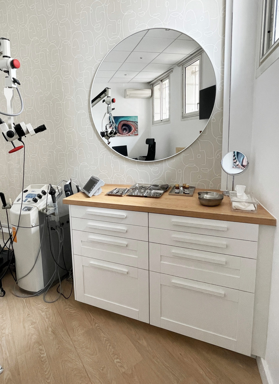 Plusieurs éléments décoratifs ont été choisis pour rappeler l'activité du praticien. Le papier peint se compose de visages et les photos murales font un clin d'oeil au vertige et à l'oreille.