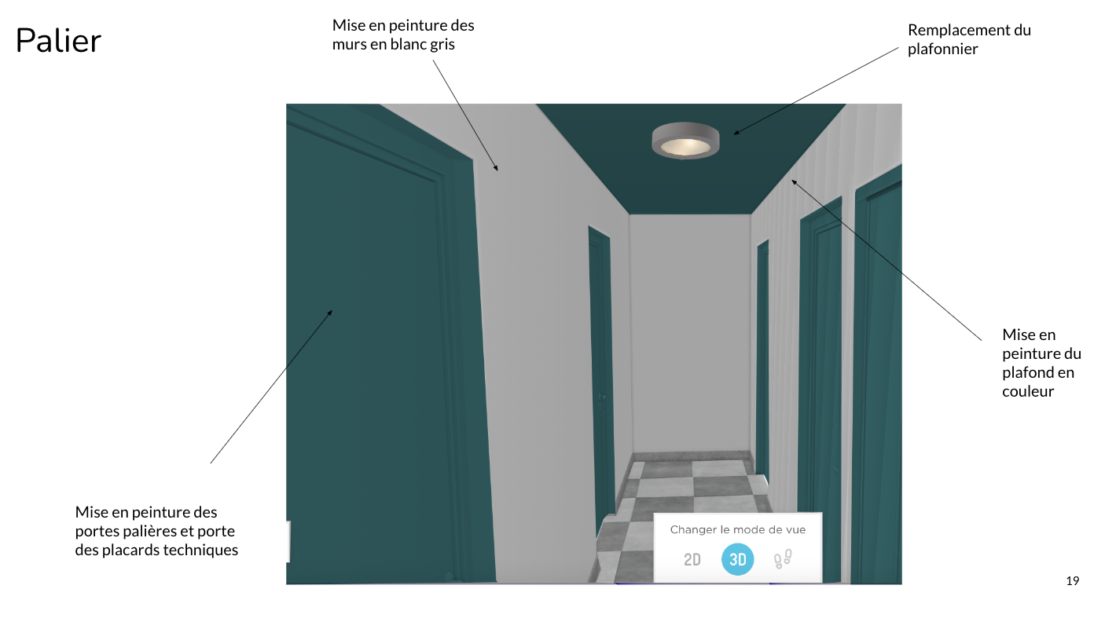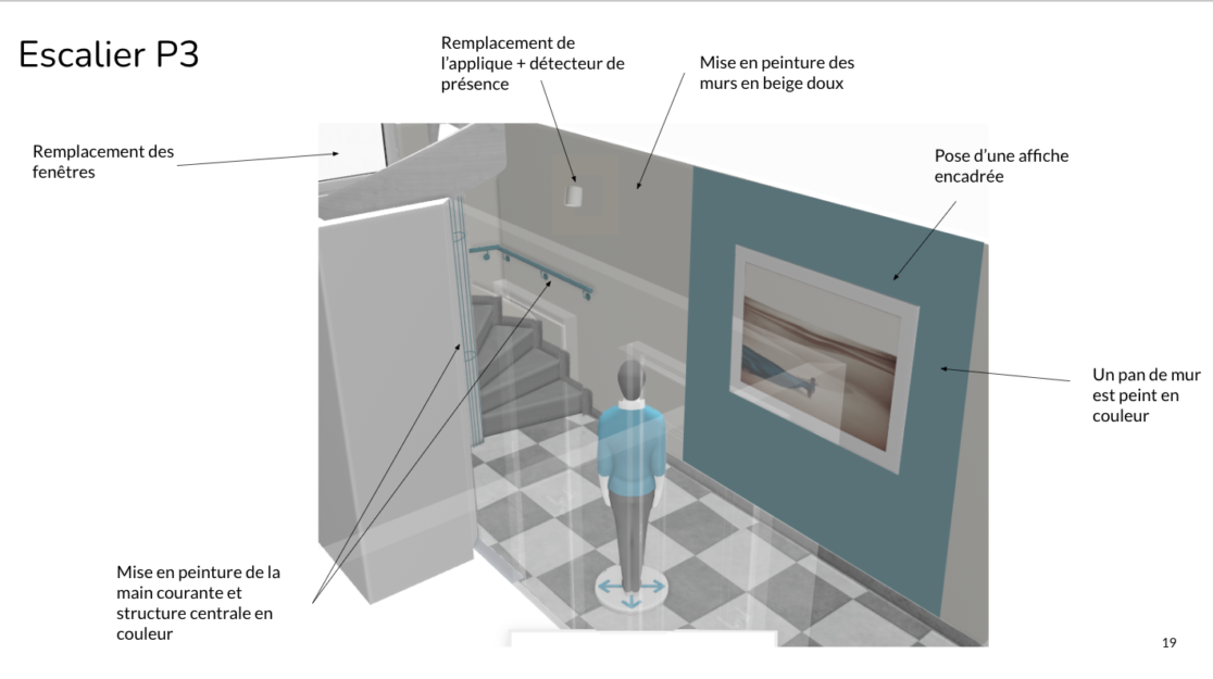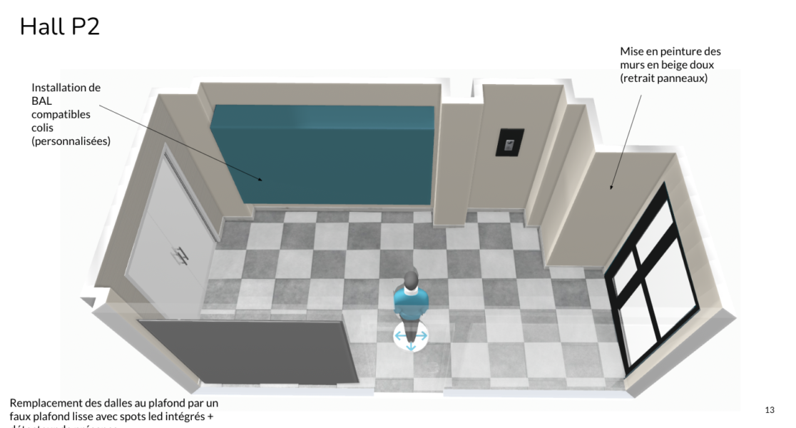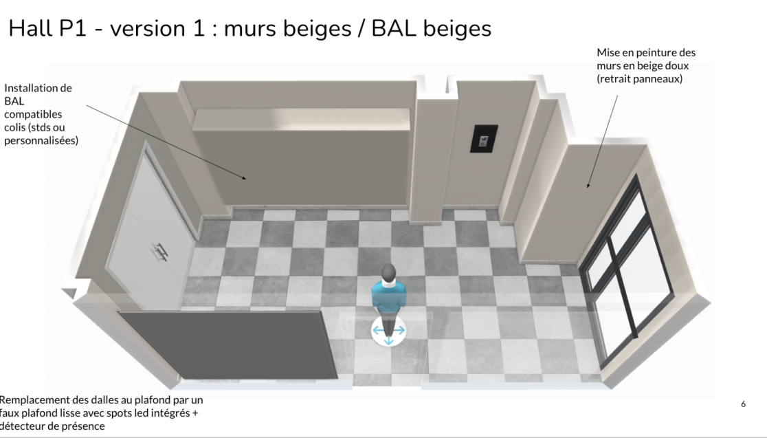 Afin de moderniser cet espace, il a été proposé de remplacer le plafond en dalles par un faux-plafond d’aspect lisse comportant des spots semi-encastrés sélectionnés par mes soins. En complément, à la place des revêtements muraux, il a été préconisé de mettre un revêtements placo hydrofuge acoustique pour réduire les nuisances sonores au rez-de-chaussée et mieux l’isoler. Ces solutions seraient peintes dans une tonalité douce pour apporter une ambiance plus chaleureuse et moderne dès l’arrivée dans la copropriété. À la demande des copropriétaires, l’installation de nouvelles boîtes aux lettres (en plusieurs teintes personnalisées) et accessoires associés a été étudiée, un miroir tout hauteur a été préconisé et un paillasson encastré dans le sol a été conçu.