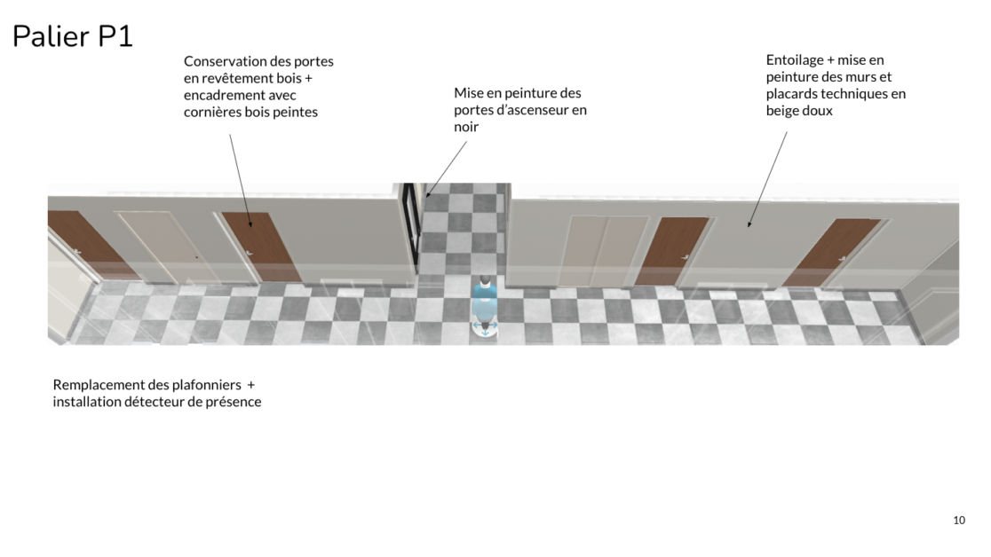 Pour donner une toute autre allure aux paliers de portes, il a été recommandé de repeindre l’ensemble des murs et plafonds dans une teinte douce et de peindre les portes en bois dans une teinte colorée (plusieurs alternatives). Ce mélange apporte à la fois de la modernité et de la gaieté. De nouveaux plafonniers de la même gamme que l’ensemble des luminaires proposés dans la copropriété ont été sélectionnés pour remplacer les plafonniers d’origine. Afin d’obtenir un rendu global esthétique, il a été préconisé de remplacer aussi les sonnettes actuelles par des solutions plus modernes et élégantes. La couleur alu a été retenue pour s’accorder avec le sol d’origine en damier de marbre gris.