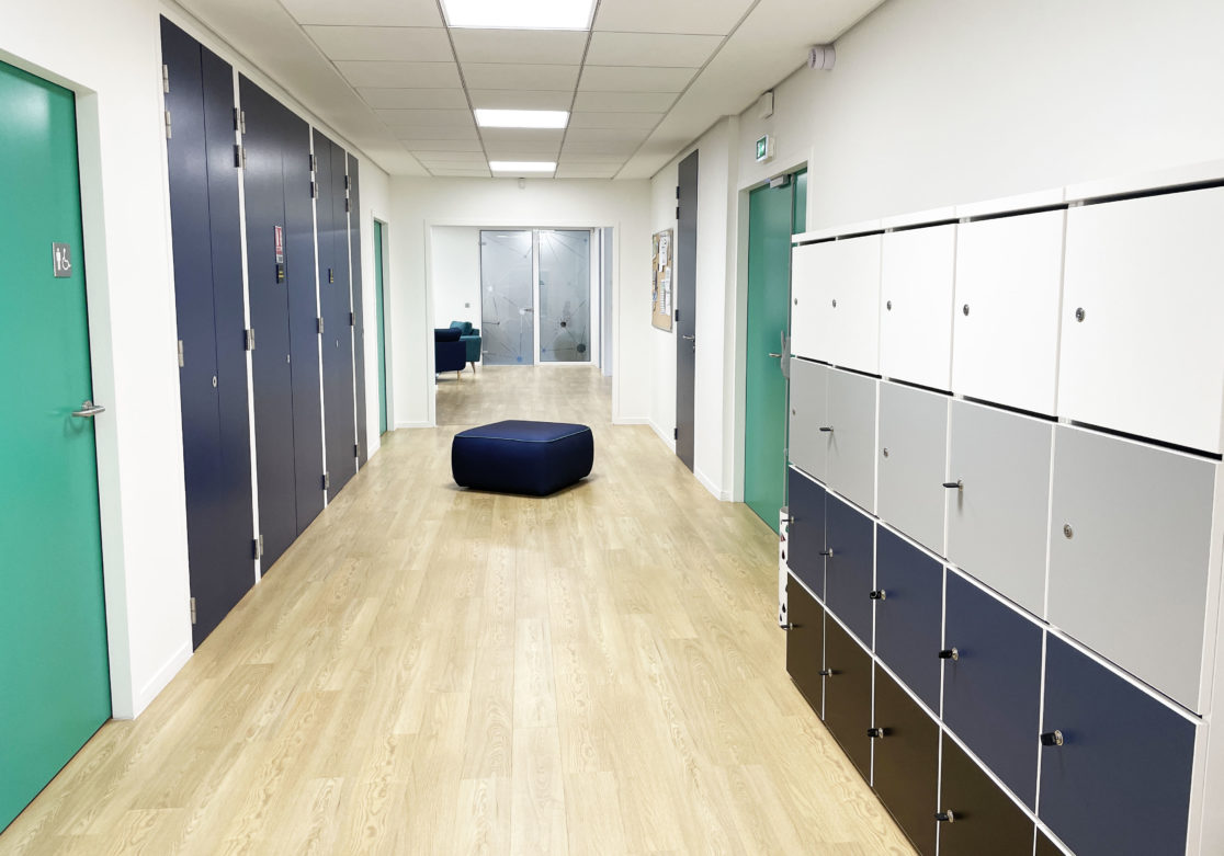 Le sas d'entrée communiquant entre l'espace existant et le nouvel espace se meuble de casiers personnalisés pour permettre aux arrivants de ranger leurs affaires en toute sécurité.