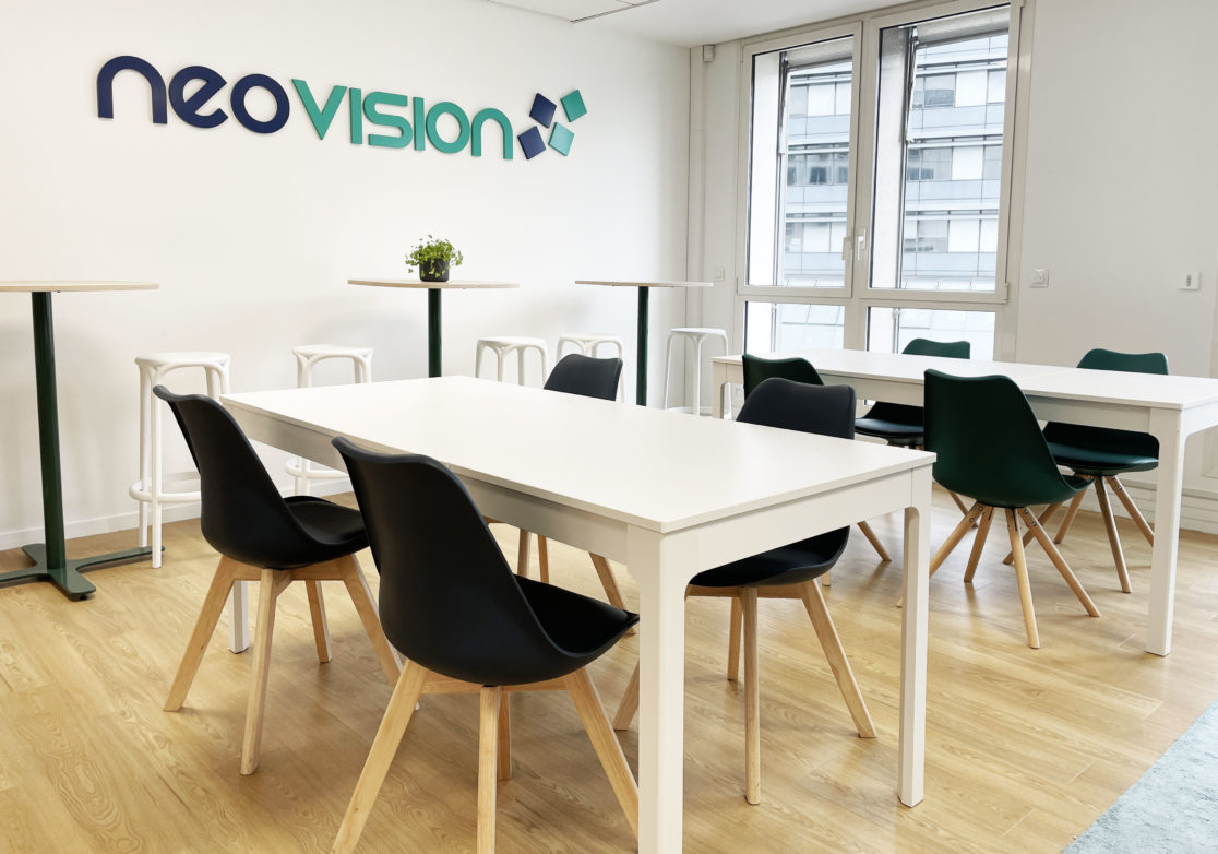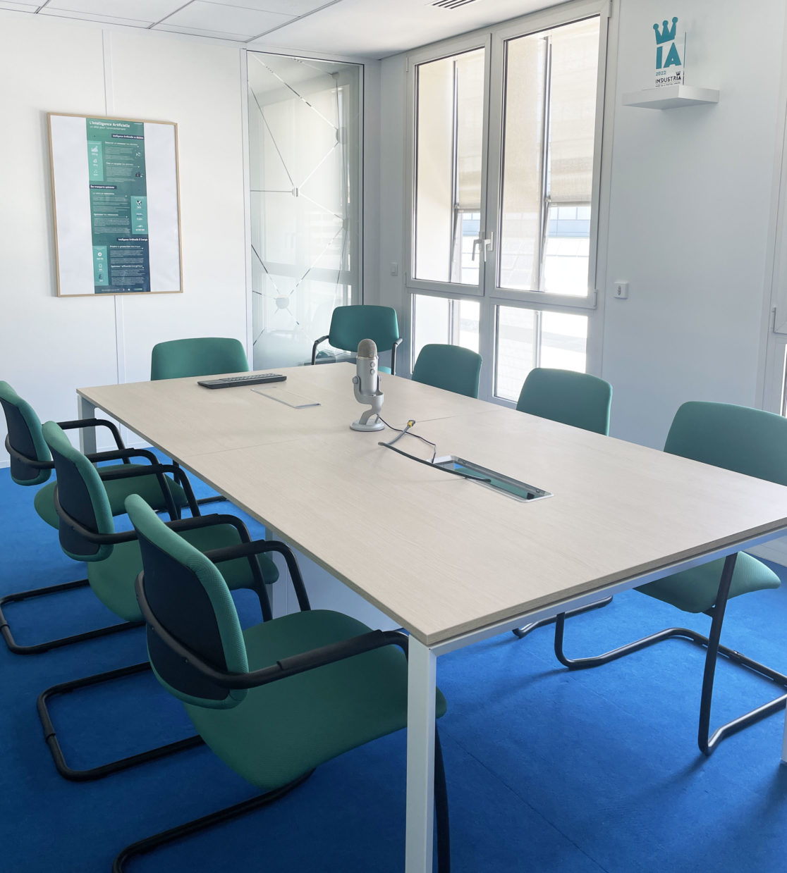 Les salles de réunion aux couleurs de la charte sont meublées avec du mobilier professionnel et ergonomique permettant un confort d'assise de longue durée et l'installation du matériel vidéo et audio nécessaire. Sur les murs des cadres affichent des infographies explicatives réalisées par la société.