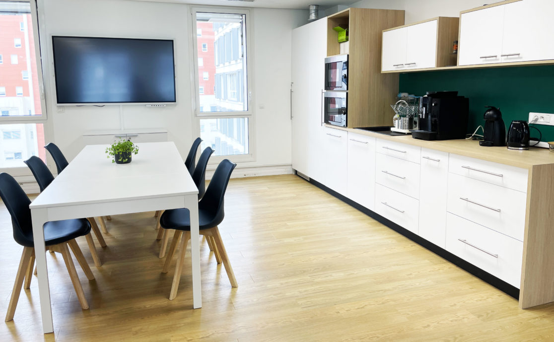 Le nouvel espace de 300m2 s'ouvre sur une grande salle de convivialité permettant aux collaborateurs de se restaurer ou de faire une pause. Assises hautes en duo, ambiance cantine à plusieurs ou coin cosy en petit groupe, ces diverses options laissent le choix de s'installer et d'échanger au gré des envies. Une cuisine ouverte facilite la circulation et modernise les lieux.