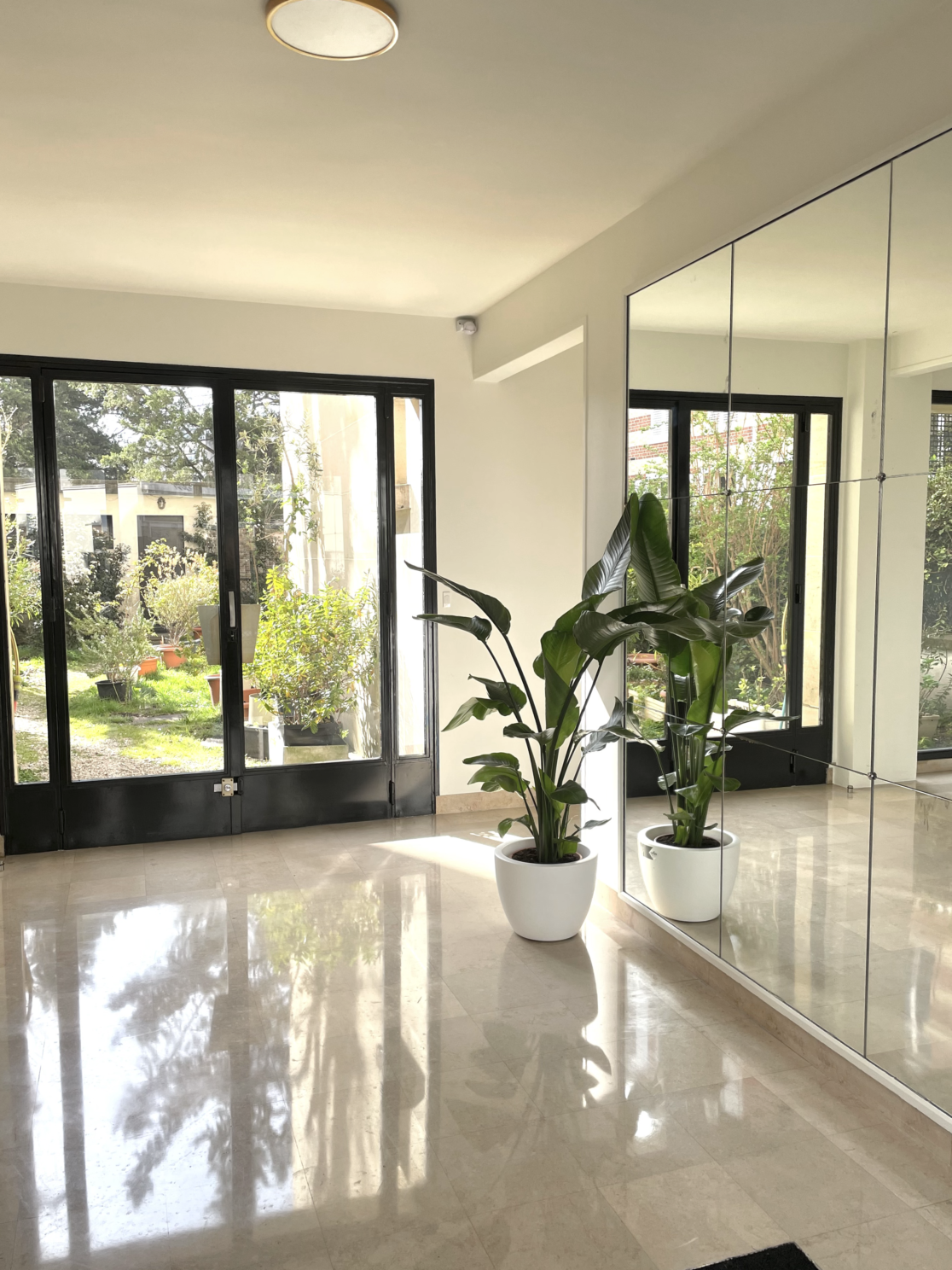Pour sublimer le cachet "Art déco" de l'immeuble, le sol en pierre a été cristallisé afin de lui donner un aspect brillant et entretenu. Les huisseries des portes vitrées ont été repeintes en noir pour apporter du contraste et personnaliser les lieux.