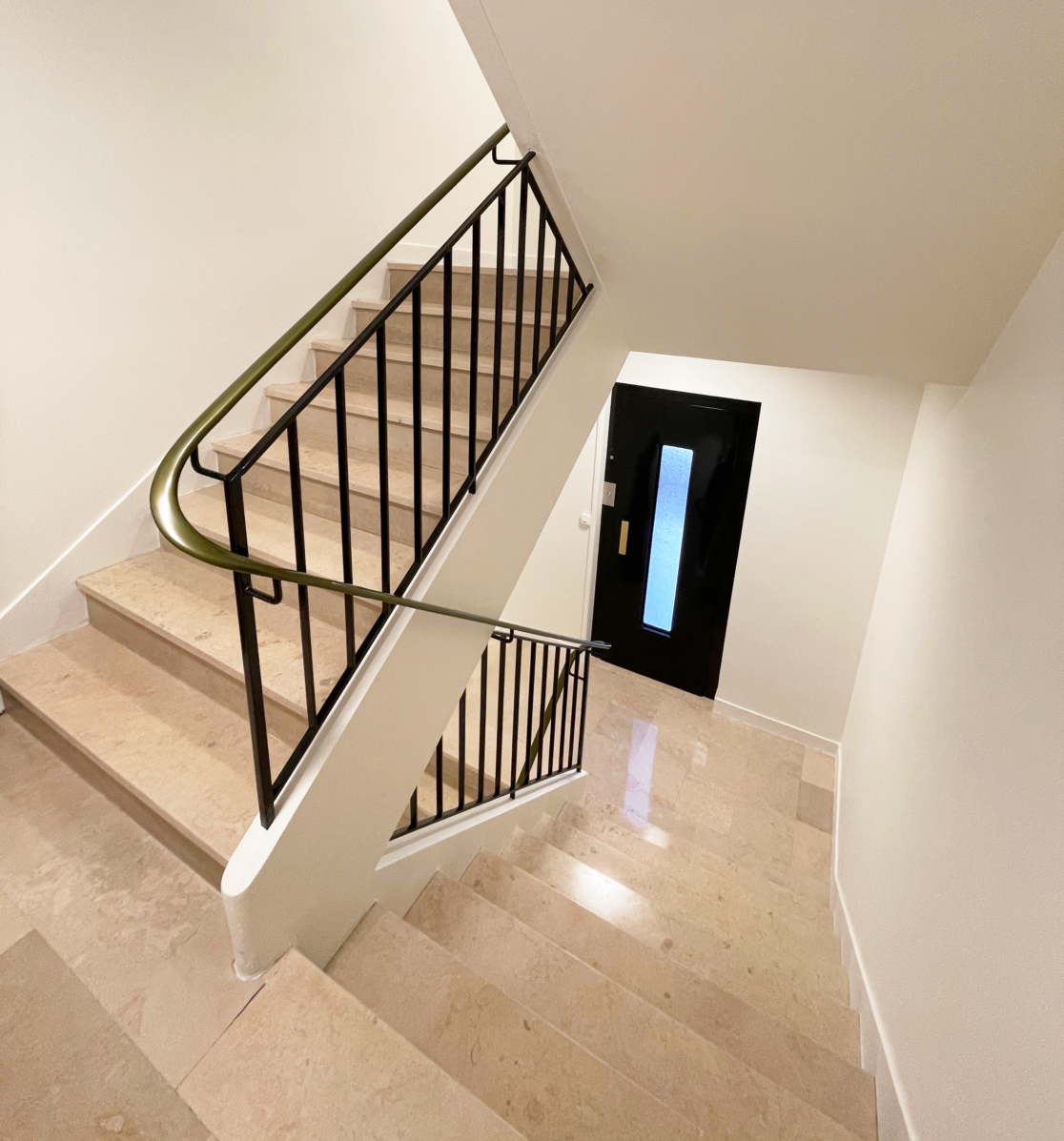 Dans la cage d'escalier, la main courante et les portes d'ascenseur ont été repeintes en noir pour valoriser l'identité des lieux. L'ensemble des peintures de l'immeuble ont été rénovées.