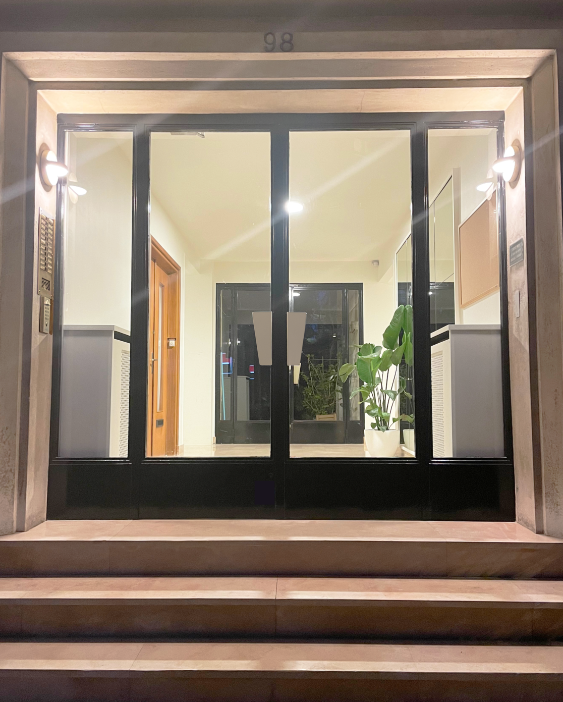 Dans l'entrée, deux appliques dans un style art déco moderne et une nouvelle platine en laiton pour l'interphone ont été installées.