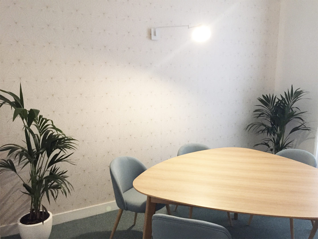 Pour un cabinet immobilier, la salle de réunion a été conçue selon les codes de l'hôtellerie afin de donner un résultat final très esthétique. Un meuble fermé a été proposé pour supprimer la sensation de désordre. Une table organique et des chaises modernes et confortables viennent meubler l'espace. Un des murs se pare d'un papier peint chic pour donner du relief à l'ensemble de la décoration.